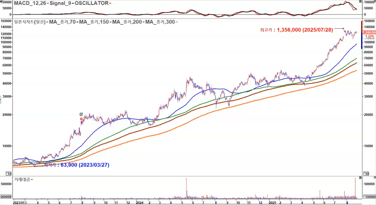 2025년 7월, 전고점을 넘어서 1,356,000원을 기록한 이 종목은 강세장의 진정한 주도주로 자리매김했습니다.