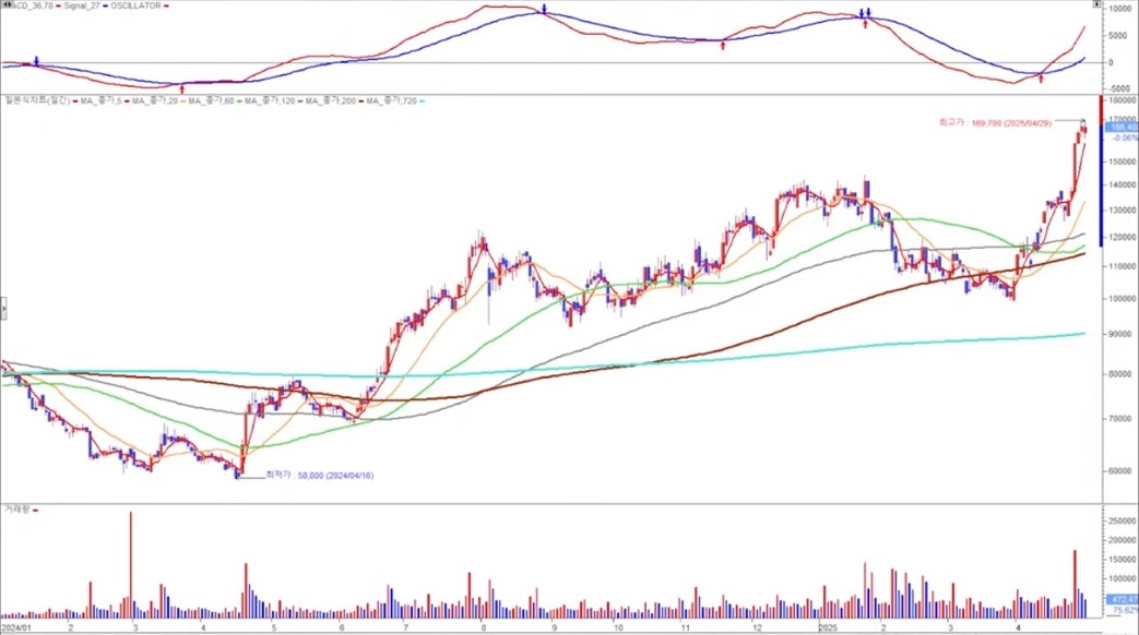 오히려 이를 기회로 삼은 세력의 매집으로 4월 29일 최고가 169,700원을 기록하게 됩니다.